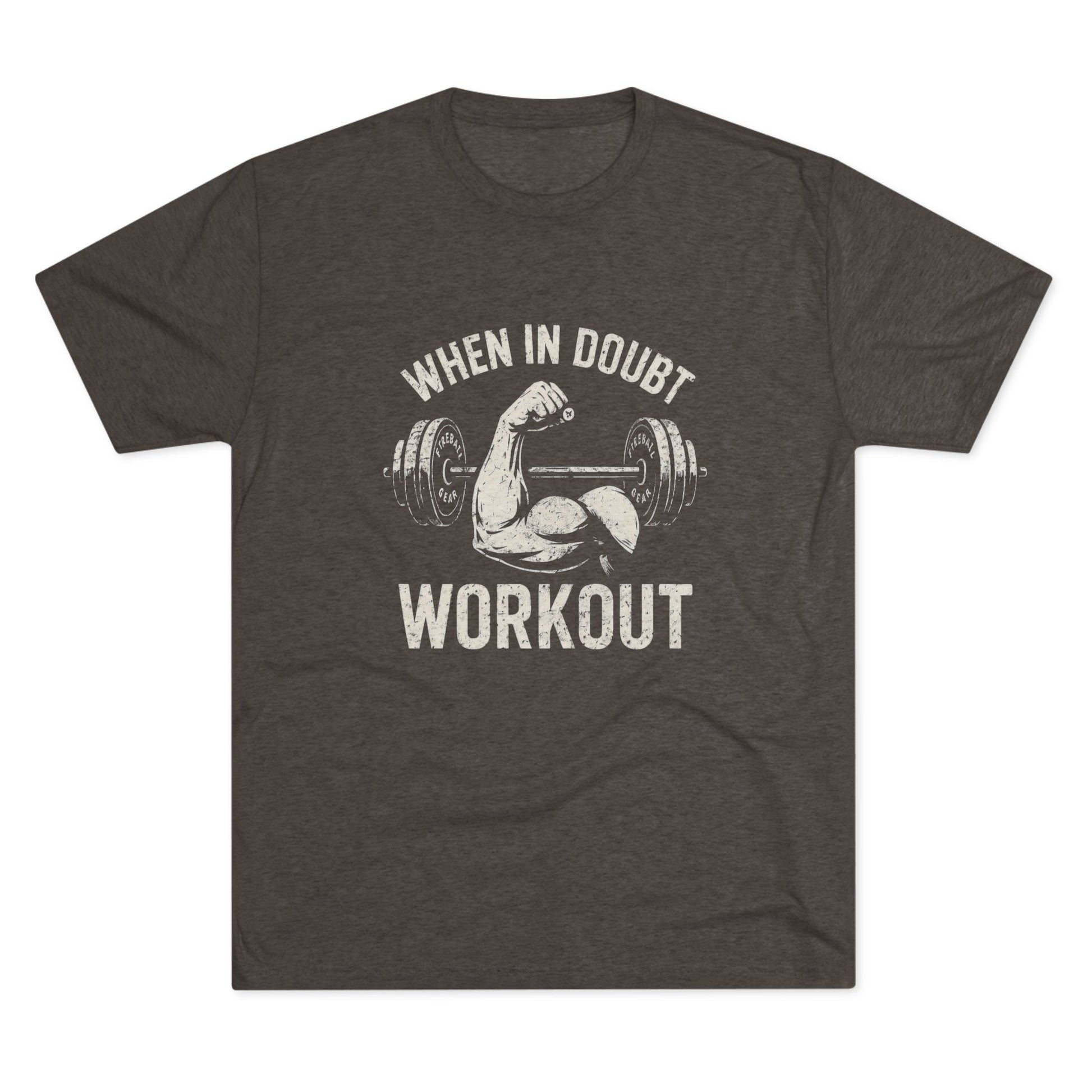 Push past excuses with the When in Doubt, Workout fitness tee from Fireball Gear. This premium triblend T-shirt delivers ultra-soft comfort and athletic fit — perfect for the gym, grind, or daily motivation. Designed by Fireball Enterprise for those who never quit.